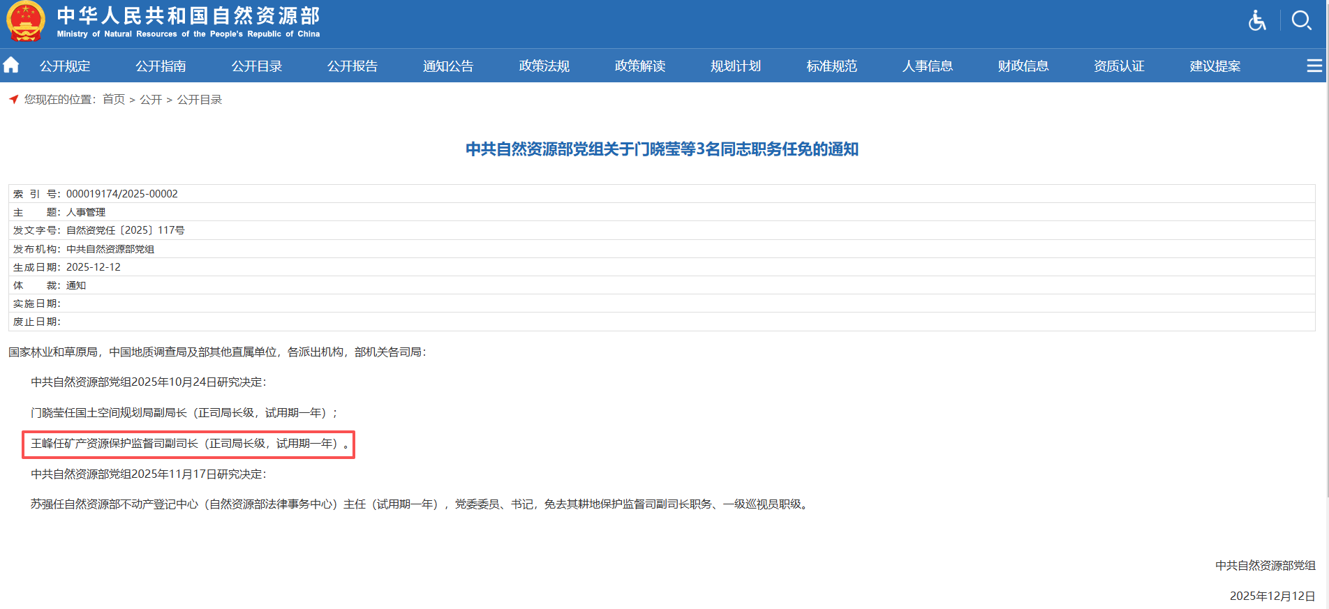 2025年,任自然资源部矿产资源保护监督司副司长(正司局长级,试用期一年)。